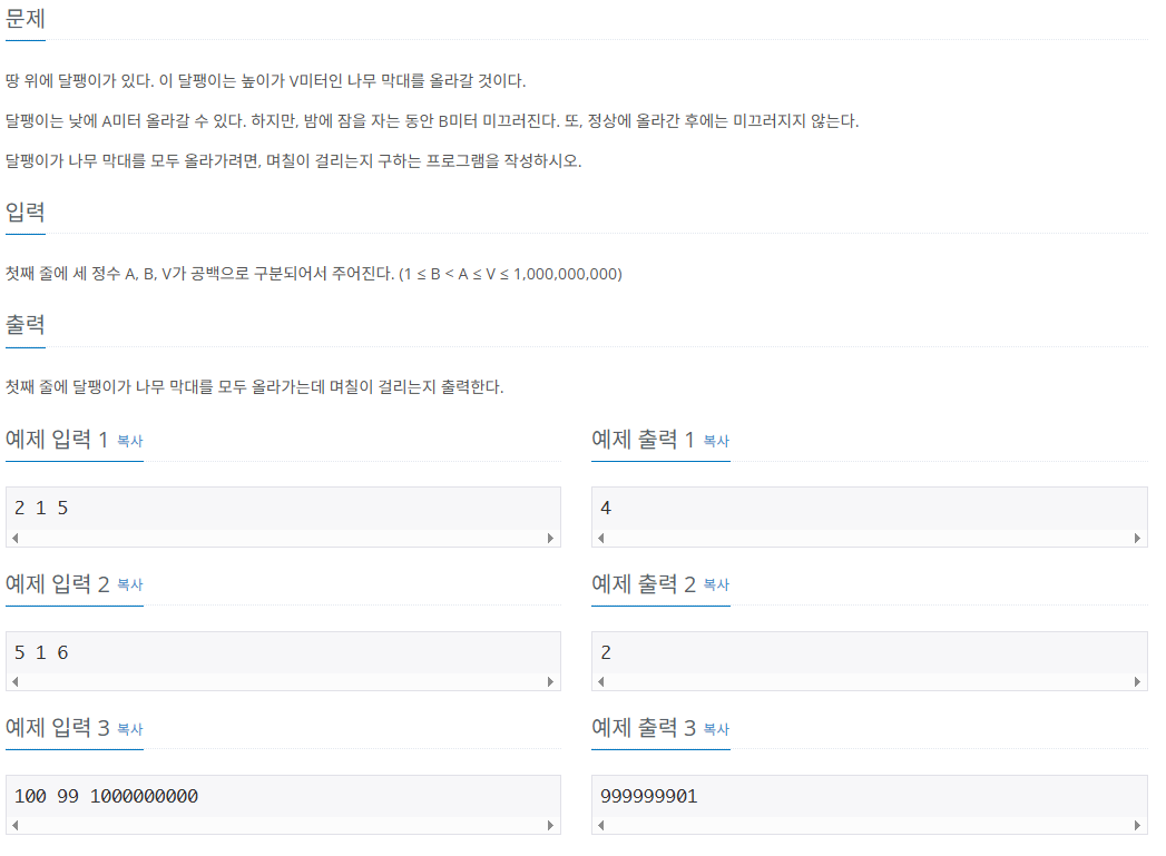 이 문제는 달팽이가 목표지점까지 몇일만에 올라갈 수 있을 지 구하는 문제다.