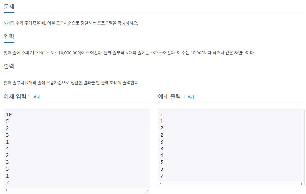 천만개를 정렬하면 약 2억번 이상의 연산을 해야하기 때문에 sort()도 정석적인 sort 알고리즘들도 시간초과가 걸리는 것이다.