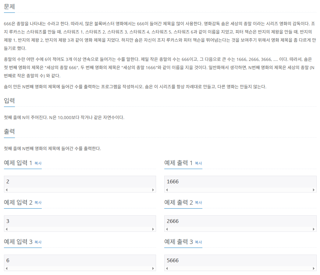 일단 이 문제를 보고 혹시나 다른 트릭이 존재할까봐 여러가지로 생각해 봤는데, 해결책을 찾지 못하고 결국 for문으로 돌면서 하나하나 종말의 수를 찾아나갔다.