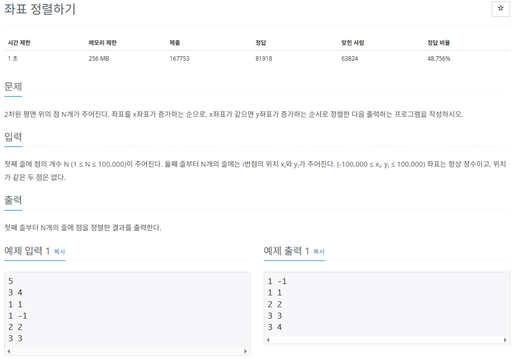 좌표 x,y가 주어질때 x의 오름차순으로 정렬하라.