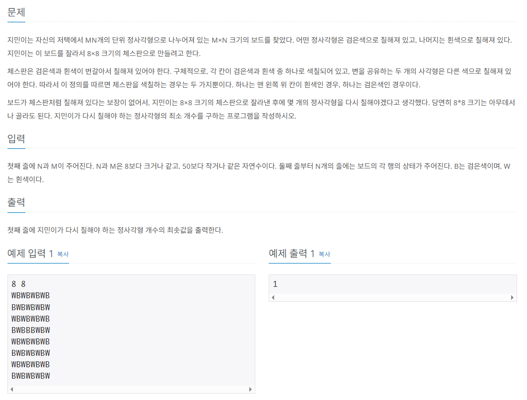 처음에는 체크보드와 제일 유사도가 높은 부분을 배열에서 찾아내고 그 다음 몇개를 색칠해야 할지 계산하는 식으로 문제를 풀어보려고 했는데, 비약이 너무 많았다. 하지만 다른 방법은 생각도 안나고 결국은 다른 사람들의 풀이를 살펴보았다.