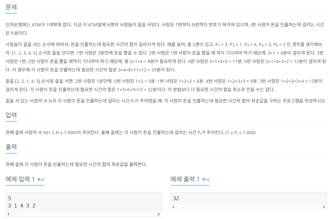 각 사람이 ATM기에서 돈을 인출하는 시간이 주어질 때 n명의 사람이 모두 돈을 인출할 수 있는 최소한의 시간을 구해라.
