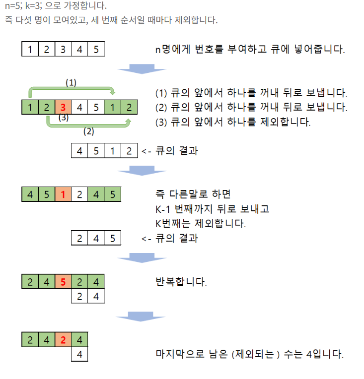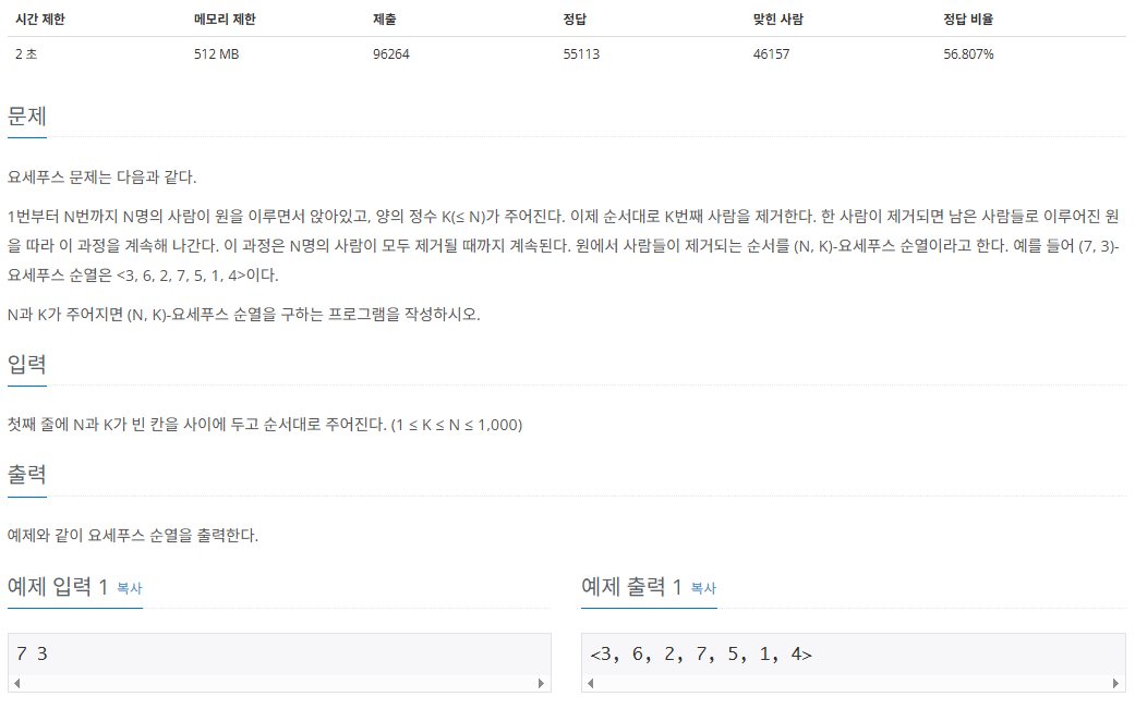 요세푸스 순열이란것을 알게되었다. 처음 보는 수열이였는데 큐를 사용하지 그렇게 어렵지 않게 구현할 수 있었다.