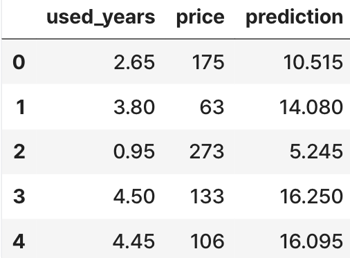 이제 본격적으로 사용연수를 사용하여 중고가를 예측해 보도록 하겠습니다.