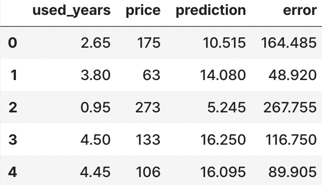 생각보다 예측값이 많이 차이 나네요. 실제값과 예측값의 오차를 계산해 봅시다.