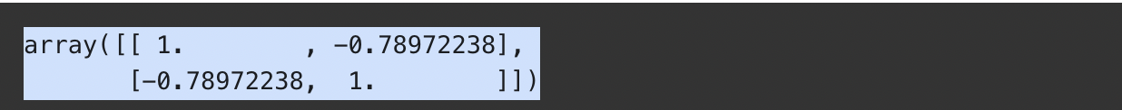 (0,1)과 (1,0)의 값을 보면 -0.789...로 -1에 가까운 것을 알 수 있습니다. 따라서 두 변수는 강한 상관관계가 있습니다.