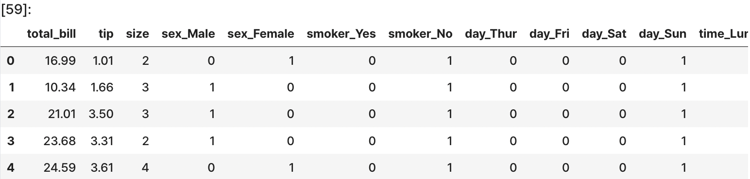 X = tips[['total_bill', 'size', 'sex_Male', 'sex_Female', 'smoker_Yes', 'smoker_No',