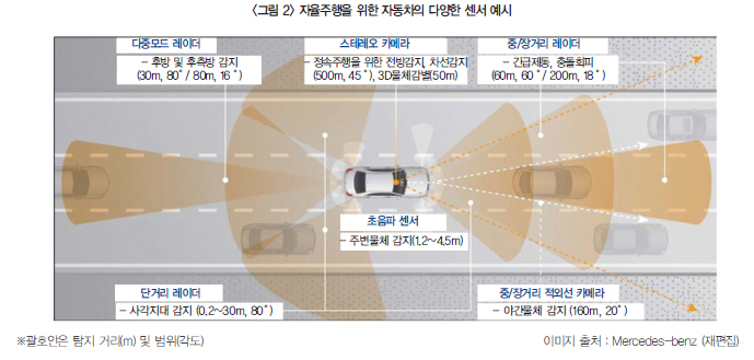 - 자율주행 차량은 차량에 장착된 레이더, 라이다, 카메라, GPS 및 초음파 센서 등 다양한 종류의 센서들을 통해 주변 환경을 인식한다.