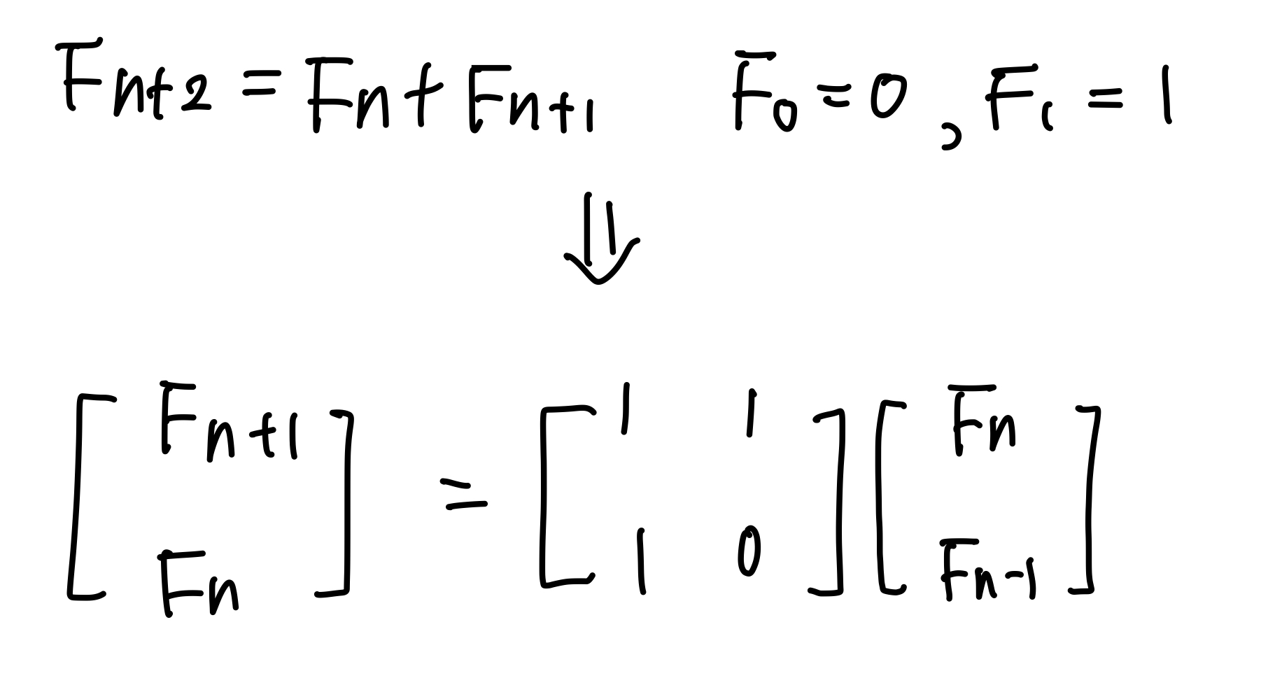 먼저, 이 피보나치 점화식을 행렬로 나타내면 아래와 같다.