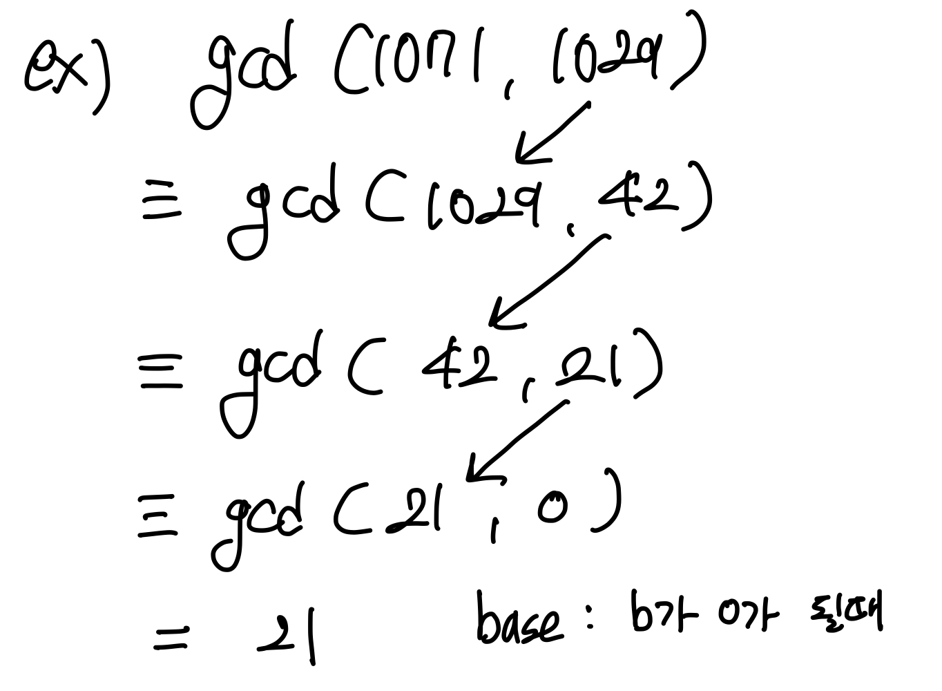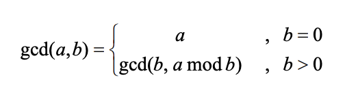 유클리드 호제법은 같은 연산이 반복되고 종료조건으로 r이 0이 될때, 위에 식에서는 b가 0으로 들어올 때 종료조건을 만족 함으로 재귀적으로 해결할 수 있겠다.