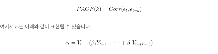 : yt와 y(t+k)사이에 correlation을 측정하는것은 동일하지만 t와 t+k 사이에 다른 y값을의 영향력을 배제하고 측정.