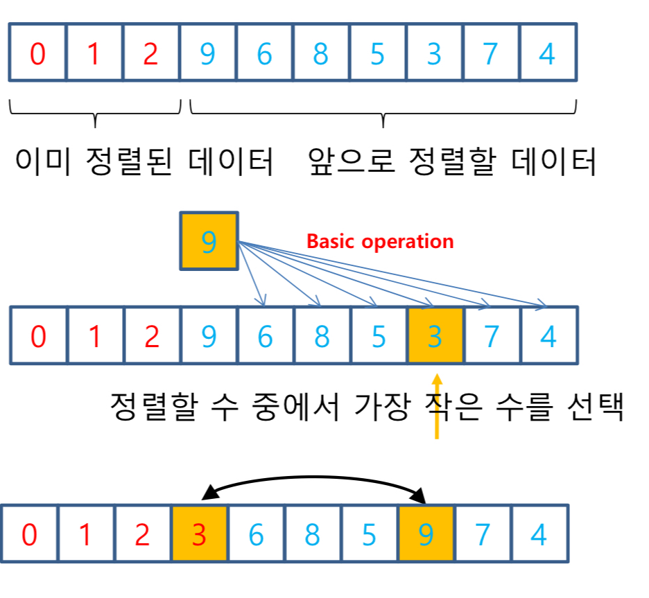 - 아직 정렬이 안된 배열에서 가장 작은 수를 찾는다. min