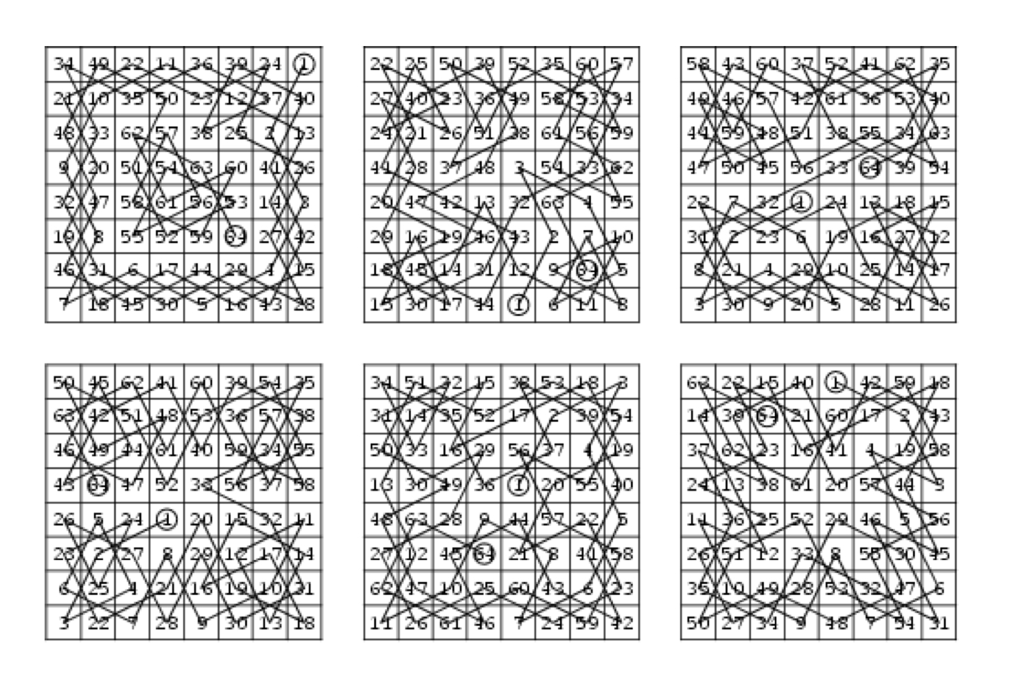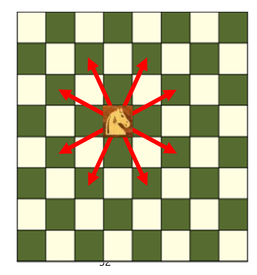 체스판에서 기사(Knight)말의 움직임은 아래와 같다. 임의의 위치에 놓여진 기사를 움직여서 모든 64개의 격자를 모두 방문하도록 기사말을 옮기는 방법을 계산하라. 단, 기사가 이미 방문한 격자는 다시 방문하지 않는다.