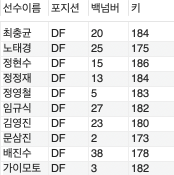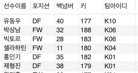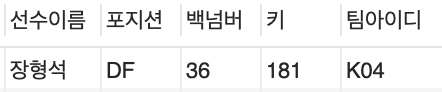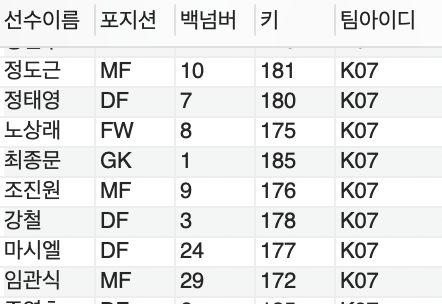 SELECT PLAYER_NAME 선수이름, POSITION 포지션, BACK_NO 백넘버, HEIGHT 키, TEAM_ID 팀아이디