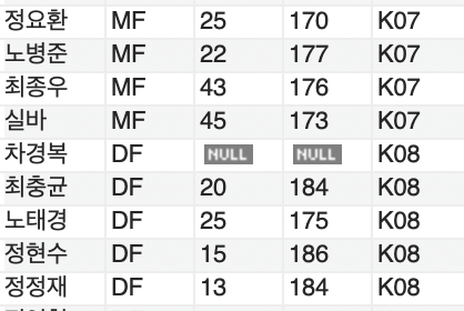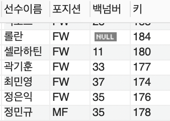OR을 사용하면 포지션이 'DF'가 아니거나 'FW'가 아닌 값을 출력하게 된다. POSITION NOT IN ('DF', 'FW')의 의미는 포지션이 'DF'와 'FW'가 아닌것을 찾는 AND의 개념이다.