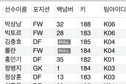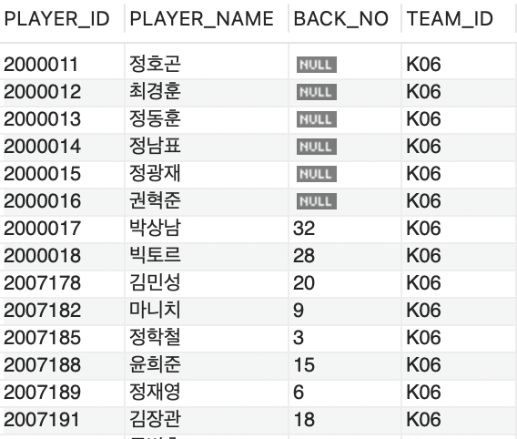 WHERE절을 사용해서 TEAM_ID가 'K06'인것만 출력할 수 있다.
