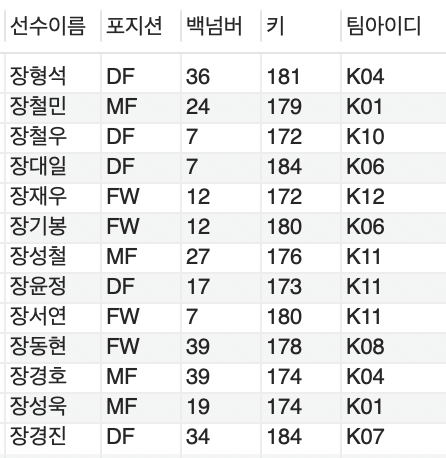 선수이름이 '장'으로 시작하지 않고 포지션 명이 'F'로 끝나지 않는 선수들만 출력한다. '%F%' 이렇게 하면 포지션 명에 'F'가 포함하는 모든 선수들을 제외시킨다.