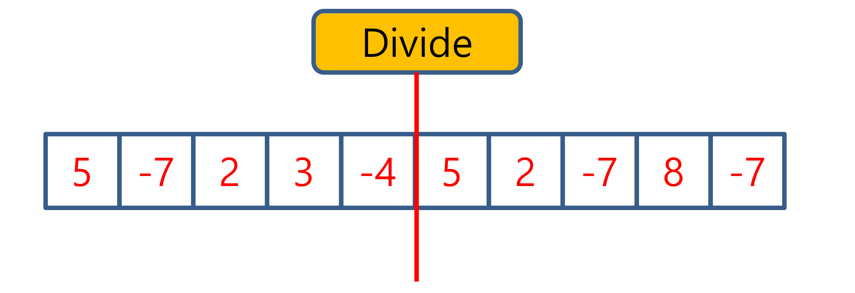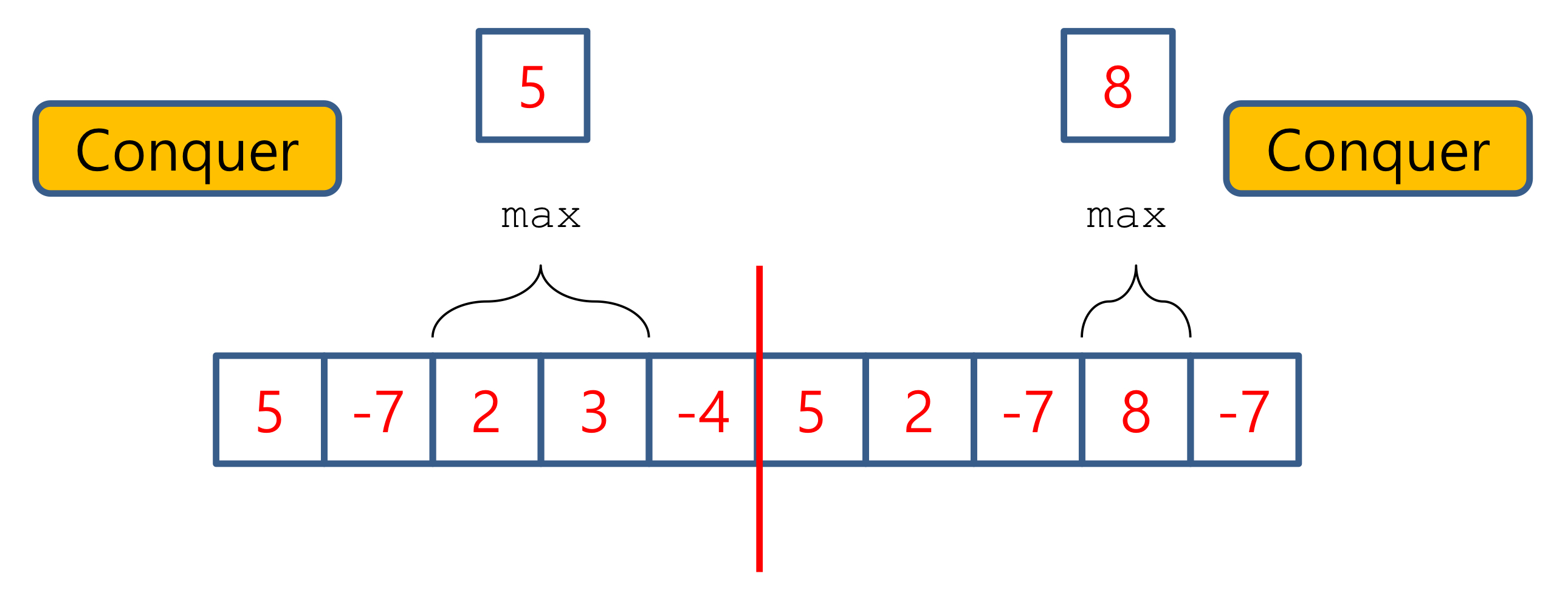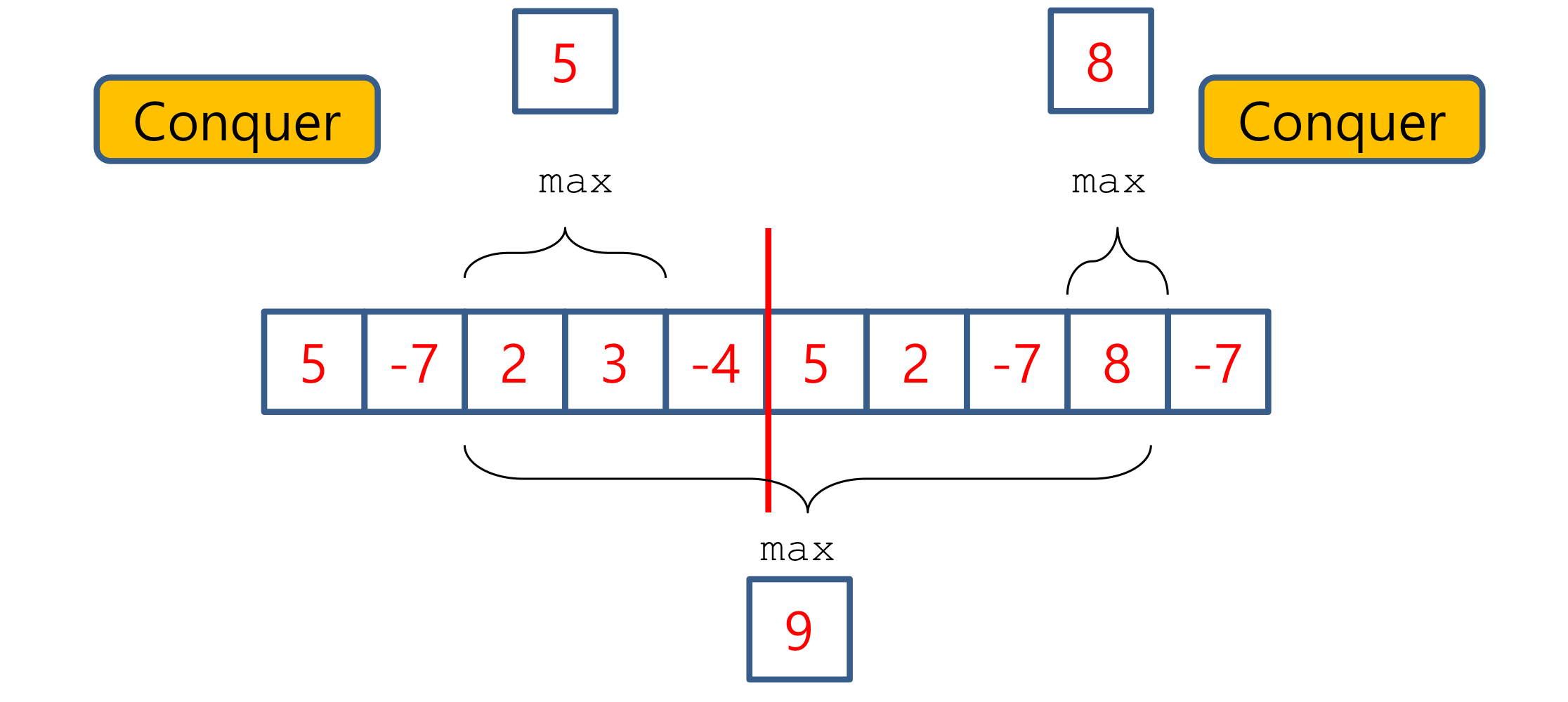 Combine : Conquer 단계에서 계산한 값과 다음 과 같이 연속된 구간이 중앙을 걸쳐서 존재할 수도 있으므로 이런 경우도 해결해야한다. 이를 위해서는 중앙을 중심으로 왼쪽으로 연속적으로 최대학 되는 값과 중앙을 중심으로 오른쪽으로 연속적으로 최대가 되는 값을 구하여 합한다.