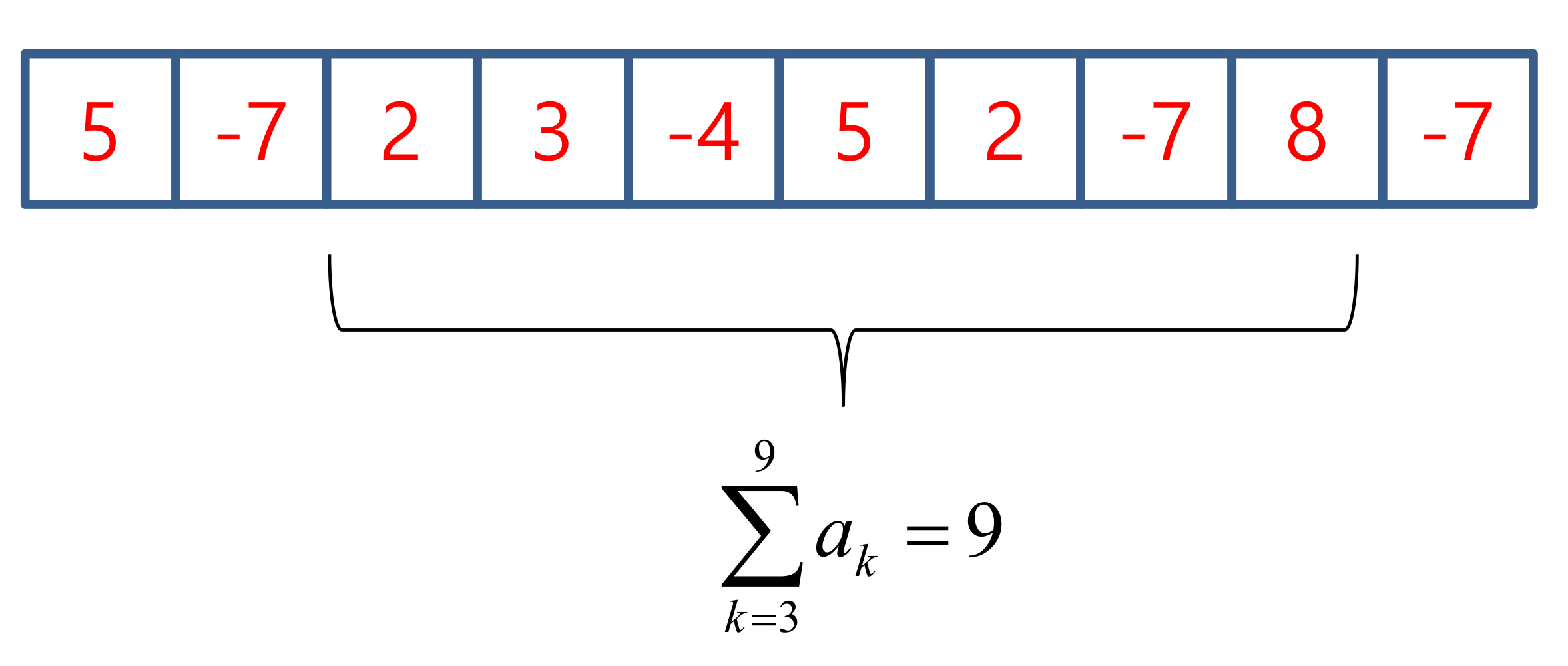 이 배열에서 가장 큰 합을 가지는 연속적인 서브 배열은 [2, 4], [2, 7], [2, 8], [3, 4], [3, 7], [3, 8], [10, 11] 등으로 최대합은 5이다.