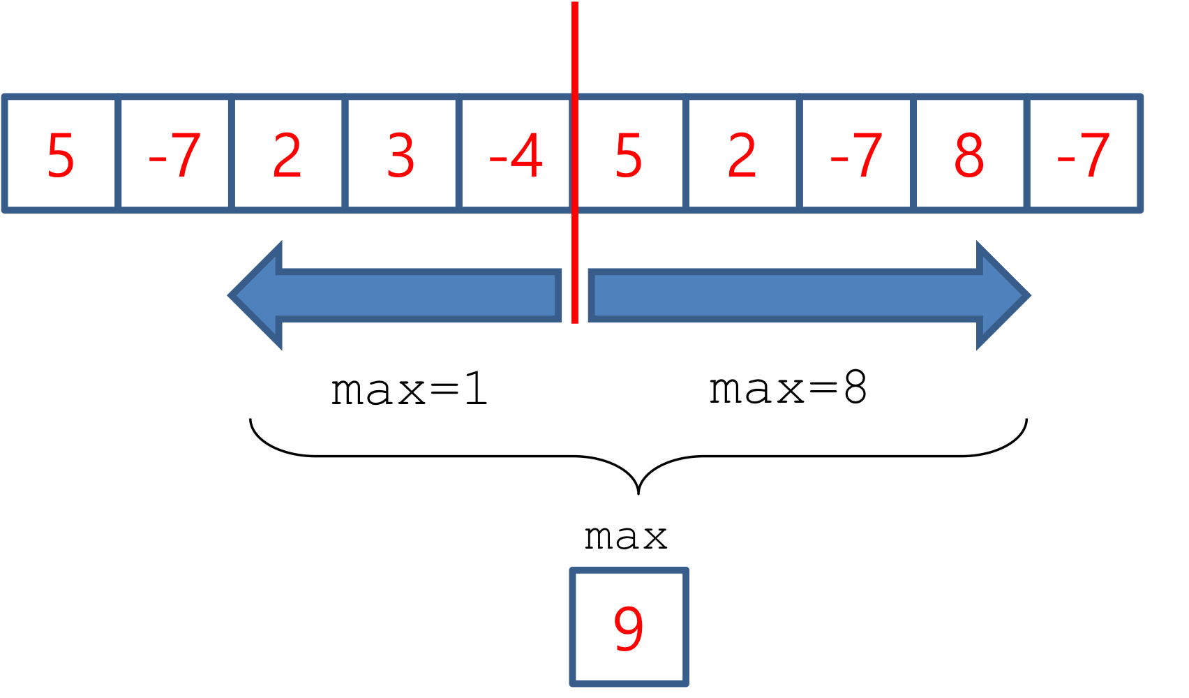 따라서, 전체 데이터중에서 최대의 합을 만드는 연속적인 구간은 다음 세 값 중의 하나다.