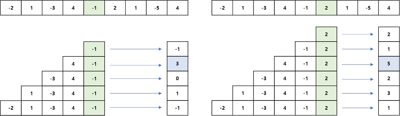 예를 들어 아래의 그림처럼 인덱스가 0부터 시작해서 0에서 시작하는 모든 서브 배열의 합을 계산한다. 그다음 인덱스 1에서 시작하는 모든 서브 배열의 합을 계산한다. 이렇게 0부터 ....... n-1까지 시작하는 모든 서브 배열의 합을 차례대로 구한다.