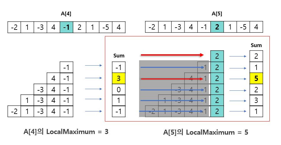 그렇다면, A[5]까지의 서브배열 합의 최댓값을 구한다면, A[5]까지의 서브배열의 합은 (A[4]까지의 서브배열의 합) + A[5]의 값이거나 A[4]까지 배열의 합이 음수라면 A[5]자신이 최댓값이 되거나 이 두가지 경우라는 것을 알 수 있다.