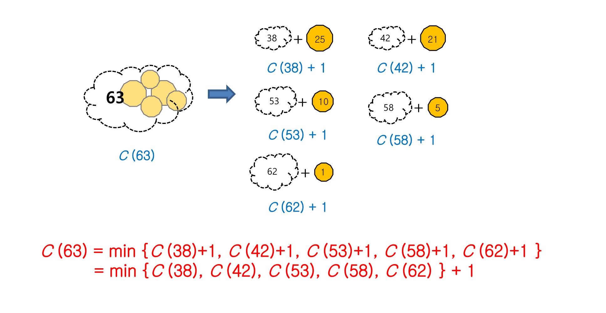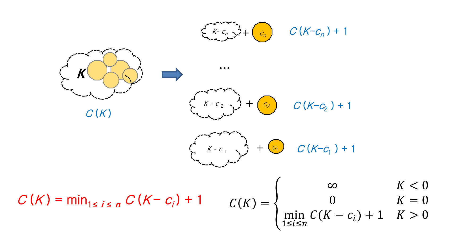 그리고 C(k)를 k원을 바꿀 때, 최소 동전의 개수라고 한다면 이렇게 표현할 수 있다.