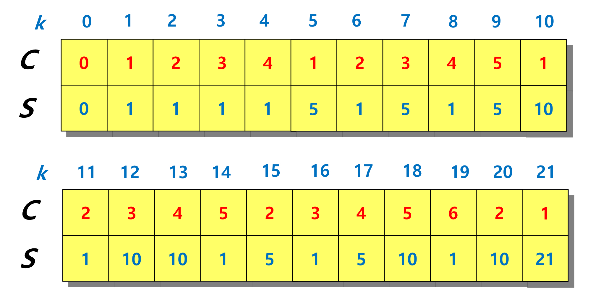 이렇게 재귀적으로 해결할 때 우리는 C(k)값을 테이블에 저장해야한다. 그래야 같은 계산을 또 반복하지 않기 때문이다. 동전계산 문제에서는 최소값으로 선택된 동전갯수와 마지막에 추가한 금액을 저장하면 된다.
