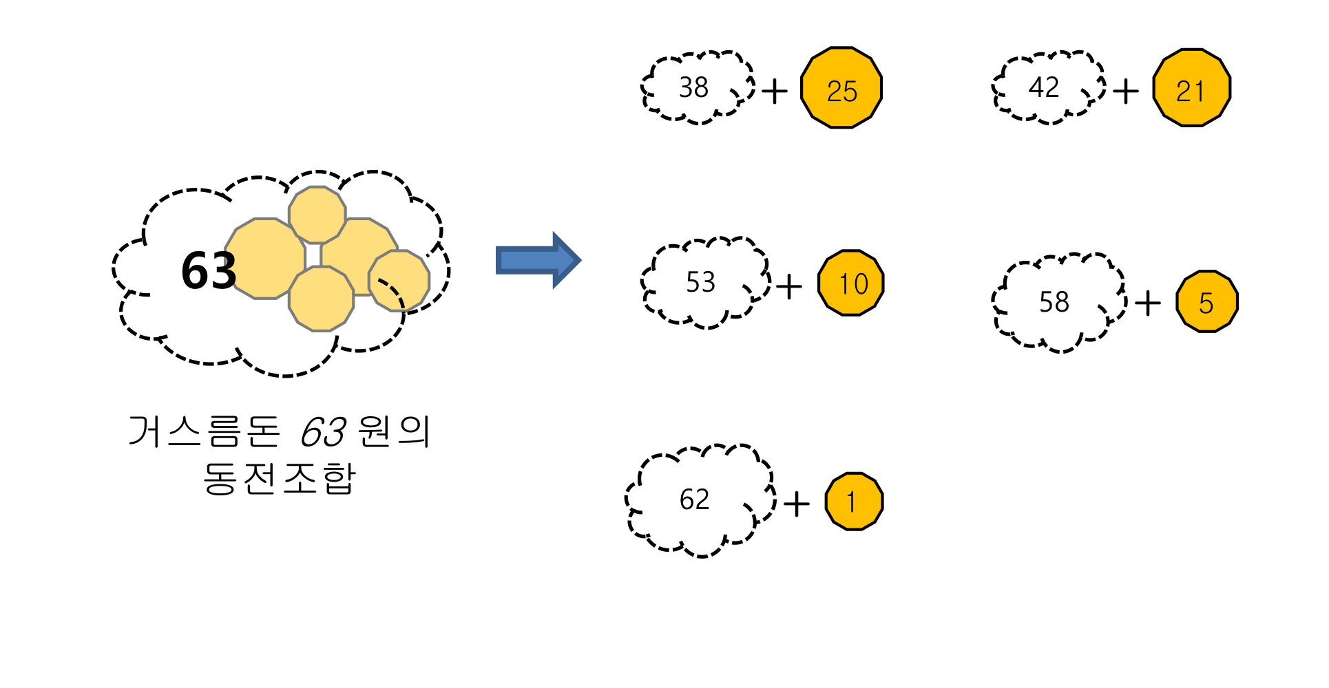 여기서는 거스름돈 63을 만들기 위한 조합을 생각한다.