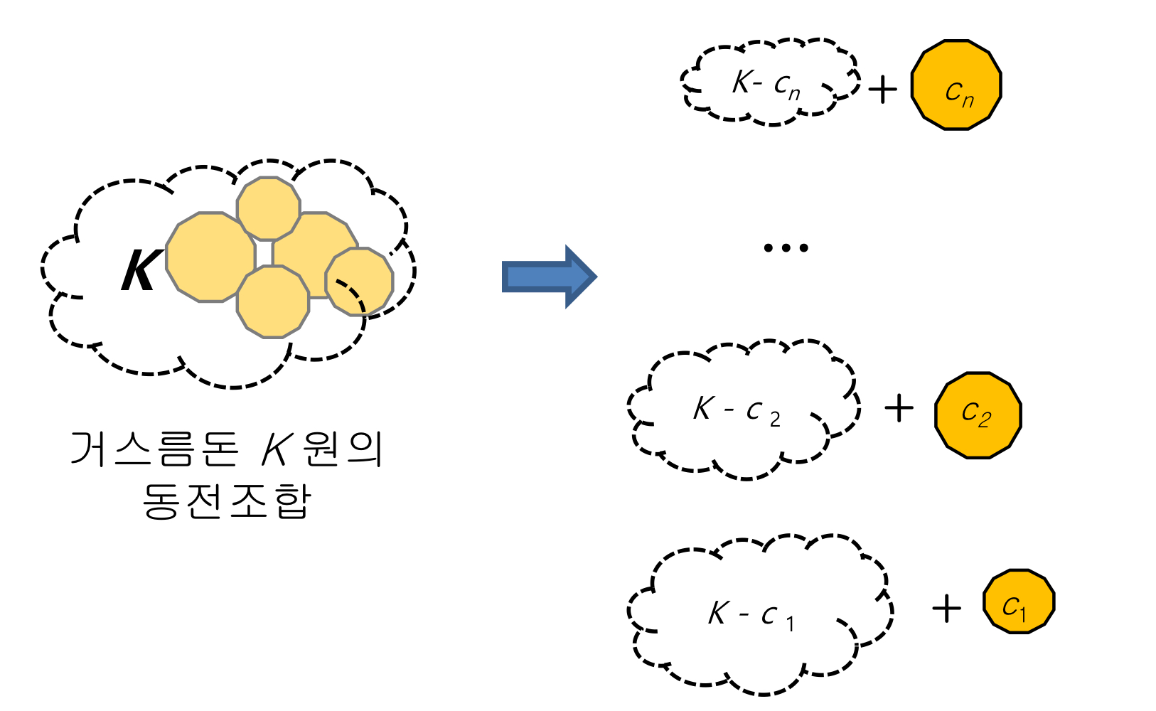 그리고 C(k)를 k원을 바꿀 때, 최소 동전의 개수라고 한다면 이렇게 표현할 수 있다.