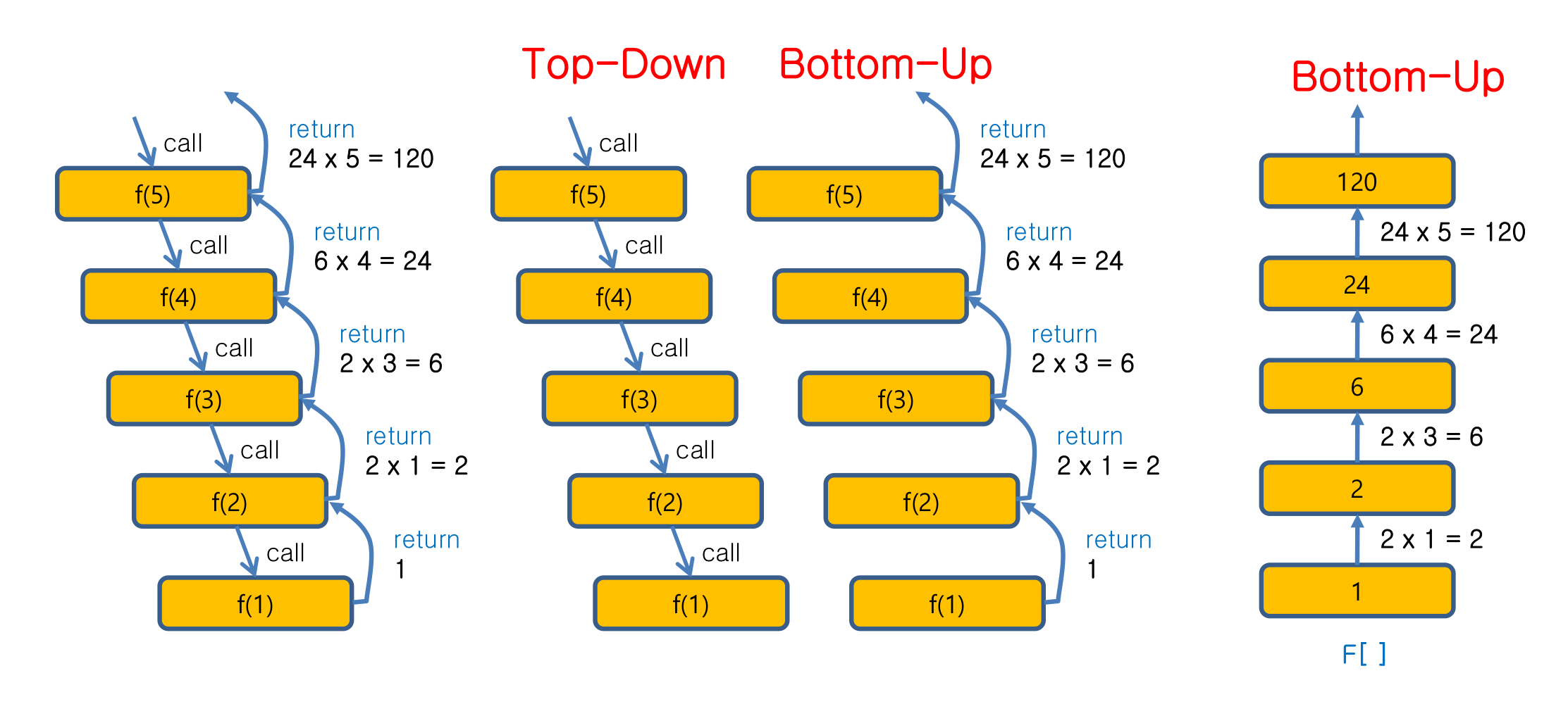 Dynamic Programming의 문제해결방법은 반복연산을 제거하는 것에 있다. 이것을 Bottom-Up Approach라고 한다. 작은 문제부터 시작하여 작은 문제를 해결할 후, 그 해답을 테이블에 저장하고 큰 문제를 해결하면서 작은 문제의 해답을 사용하는 것이다.