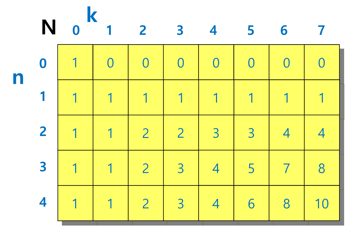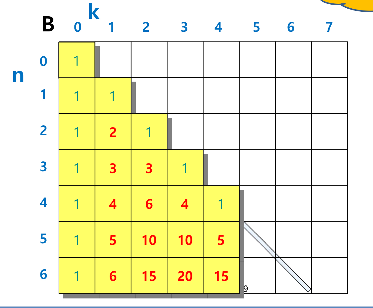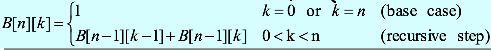 k가 0인 경우는 base case로 모두 1의 값을 갖는다. 또 k=n인 경우도 base case로 모두 1의 값을 갖는다.