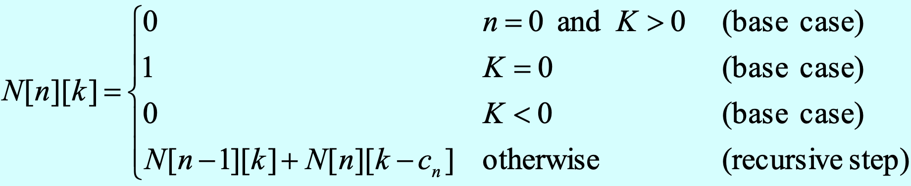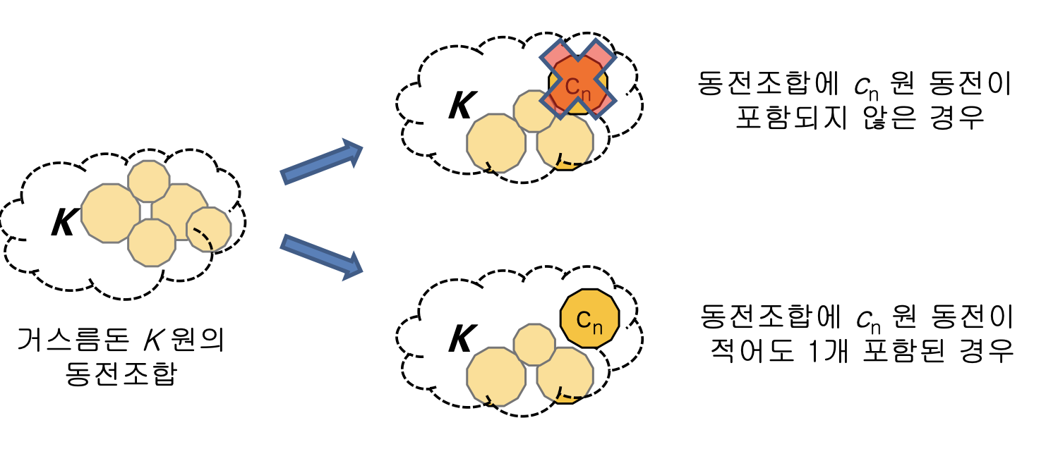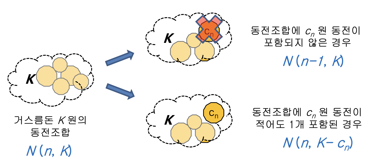 이것을 재귀식으로 나태니면, K원을 n개의 동전으로 교환하는 동전조합의 수는 다음과 같다.