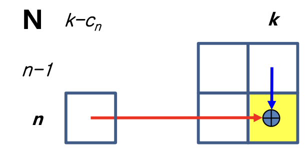 k=0일 때 base case에 따라 모든 값이 1이 되고 동전의 개수 n은 0이지만 거스름돈이 0원 보다 큰 경우도 basecase에 따라 모두 0이 된다. 나머지 경우는 N[n-1][k]+ N[n][k-cn]에 따라 값이 채워진다.