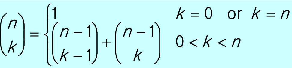 위의 두가지 식을 합하여 이항계수를 재귀식으로 나타내면 다음과 같이 나타낼 수 있다.