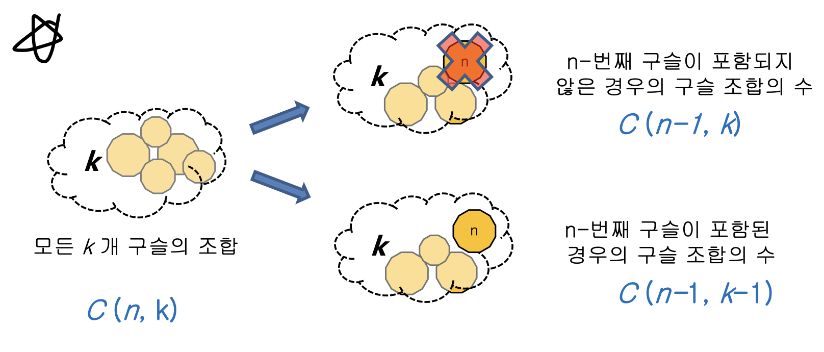 n 구슬이 포함되지 않은 경우의 구슬 조합의 수는 C(n-1, k)이다. 개의 구슬 중 마지막 구슬을 선택하지 않는 경우의 조합의 수이다. 마지막 구슬을 선택하지 않으면 나머지 n−1개의 구슬 중에서 k개를 선택하는 경우의 수와 같기 때문에 이다. 그렇다면 n구슬이 포함된 구슬 조합의 수는 C(n-1, k-1)로 나타낼 수 있다. 번째 구슬을 선택한 경우에 나머지 k−1개의 구슬을 n−1개의 구슬 중에서 선택해야 하기 때문이다. 즉, 마지막 구슬 n을 선택하면 남은 구슬들로 조합을 완성해야 하므로 이러한 관계가 성립한다. 를 수학적으로 표현하면 아래와 같고 재귀적으로 표현하면 이항계수의 재귀식과 동일하다.