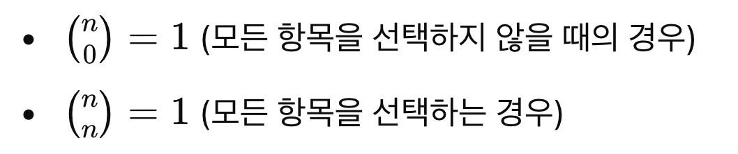 여기서 기본 조건은 k = 0일 경우와 k=n일 경우로 두가지이다. K=0이면 아무것도 선택하지 않는 다는 뜻이기 때문에 경우의 수는 아무것도 선택하지 않는 한자기 경우만 존재한다. K=n이면 모든 항목을 선택하는 1가지 경우만 존재한다.