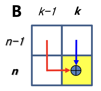 B[i][j] = B[i - 1][j - 1] + B[i - 1][j] # recursive relation