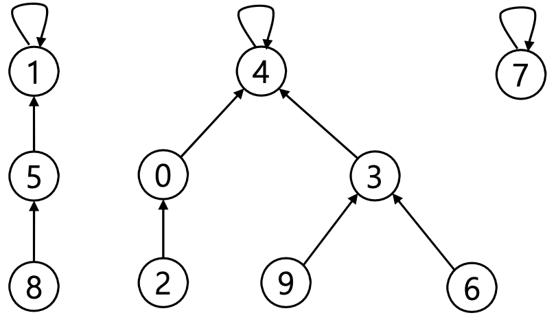 - 즉, 각 노드는 자기 자신을 부모로 가리키며, 서로 독립적인 집합을 형성