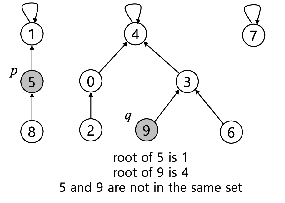 2. In_same_set 연산: 두 원소 p와 q가 같은 집합에 속하는지 확인하려면 루트 노드가 같은지 비교