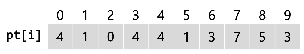- pt[0] = 0, pt[1] = 1, …, pt[9] = 9