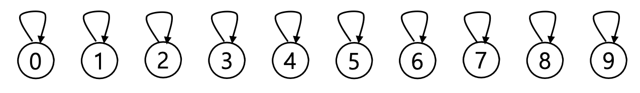 - 즉, 각 노드는 자기 자신을 부모로 가리키며, 서로 독립적인 집합을 형성