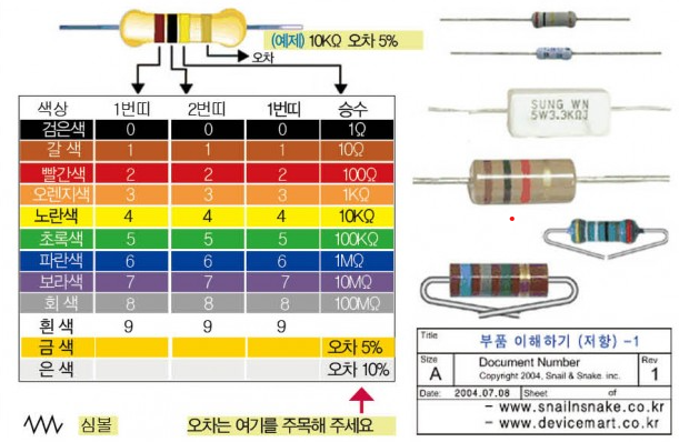 저항은 여러가지 종류가 있고 사용 용도가 조금씩 다르다. 일반적으로 널리 사용되는 종류는 1/4W, 5%오차의 저항이다. Registor에 표기된 색깔띠로 표기된 저항값의 크기를 알 수 있다. 색띠의 갯수는 보통 4개이며 맨 마지막의 색은 대부분 금색으로 5%의 오차를 나타내고 앞의 3개의 띠로 저항값을 나타낸다.