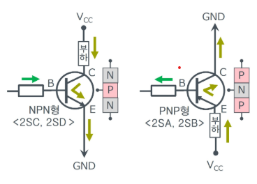 - 전압 및 전류 방향 : NPN은 베이스에 양전압을 가하고, 베이스 전류가 유입될 때 동작한다. 반면, PNP는 베이스에 음전압을 가하고, 베이스 전류가 유출될 때 동작한다.