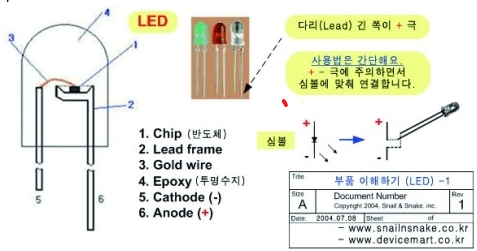 LED는 일종의 다이오드이다. 그래서 발광 다이오드라고 부른다. 다이오드는 +, - 극이 정해져 있다. 다리가 긴 쪽이 Anode로 + 극이다. LED는 반도체로 전류를 빛으로 전환하는 효율이 높아 적은 전류를 소비하며 수명도 길다. 일반적으로 디지털 회로에서 회로 상태를 모니터하기 위해 많이 사용된다.