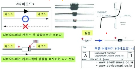다이오드는 한 방향으로만 전류를 흐르게 하는 부품으로 회로에서는 화살표 모양의 심볼로 표시된다.