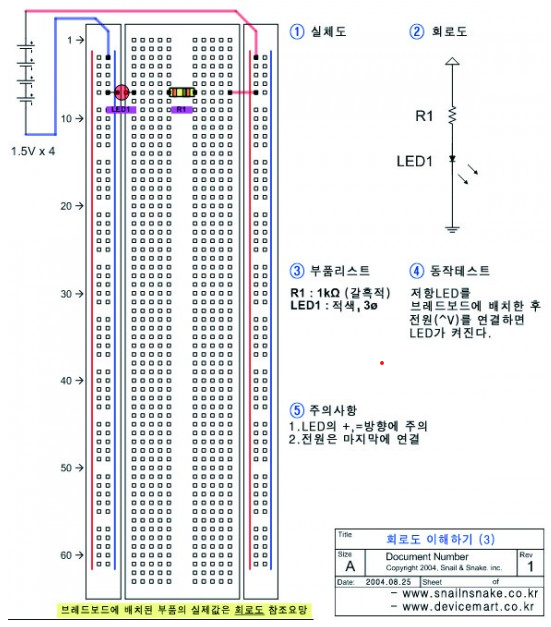 전원의 6V 전압에 의해서 R1(저항)과 LED를 통해서 약 1mA의 전류가 흐른다. 그 결과 LED가 점등하고 최종적으로 GND로 전류가 빠져나간다. LED에는 극성이 있다. 때문에, lead를 바꿔서 연결하면 LED가 켜지지 않는다. 저항의 lead는 바꿔서 연결해도 상태의 변화가 없다. 저항은 극성이 없기 때문이다. 극성이 없다는 의미는 쉽게 말해 부품의 방향, 앞뒤, 전후가 없다는 말이다.