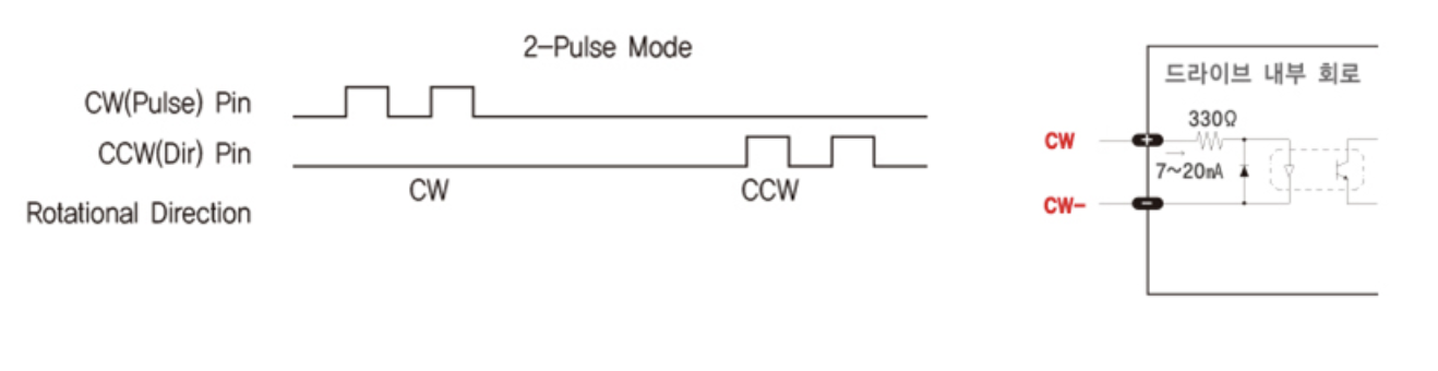 CW입력부에 펄스가 입력되면 모터는 정회전, CCW 입력 부에 펄스가 입력되면 모터는 역회전하는 방식을 2펄스 입력 방식이라고 한다.