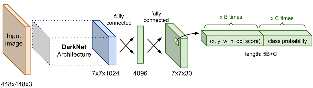 - 입력이미지 : 448 * 448 * 3 크기의 입력 이미지를 받는다.