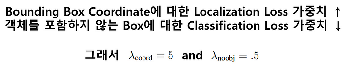 - λcoord = 5: 좌표(localization) 오차를 줄이기 위해 가중치를 증가.